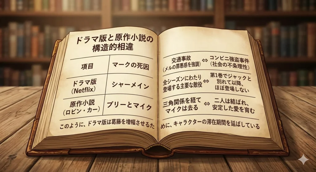 ロビン・カーによる原作小説ファンの方は、ドラマ版との違いに驚くことも多いのではないでしょうか。制作者側は、ストリーミングドラマとしての面白さを追求するために、あえて設定を大幅に変更しています。ここでは、その主な違いを表にまとめてみました。