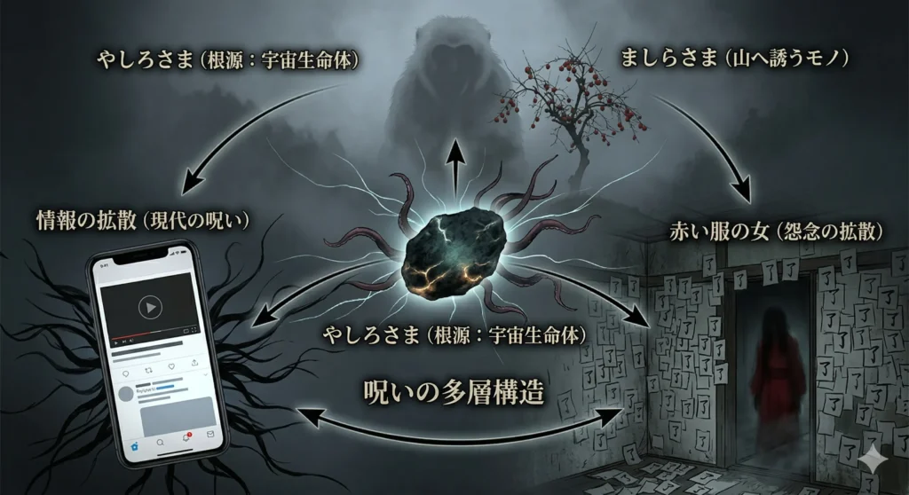 まずは、物語の表面的な恐怖の裏側に隠された、多層的な怪異の構造について深掘りしていきましょう。この作品は、断片的な情報を繋ぎ合わせることで一つの巨大な「呪い」が浮き彫りになる仕組みになっています。各エピソードがどのように関連しているのか、その全貌を整理しました。