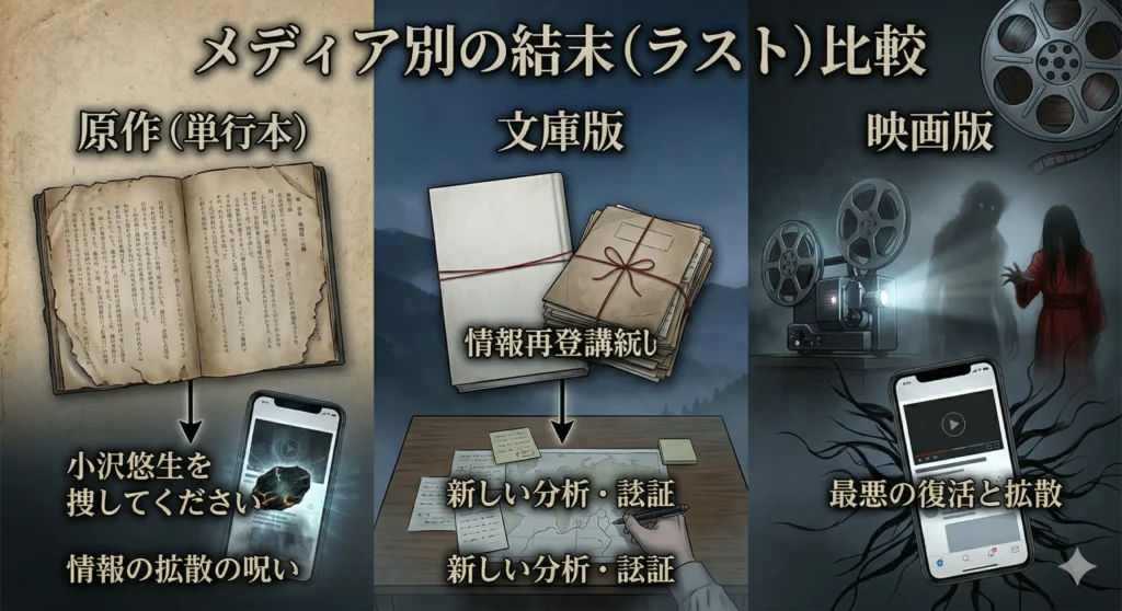 2025年に発売された文庫版では、単行本やネット連載版を読んだファンをも驚かせる大きな改変が行われました。最大の違いは、物語の視点となる「語り手」の交代です。単行本ではライターの背筋氏と編集者の小沢氏のやり取りが中心でしたが、文庫版では「小澤雄也」というベテラン編集者と「瀬野千紘」という女性編集者の視点から、過去の資料を再編纂するという形式が取られています。この視点の変更により、物語はより客観的で、どこか突き放したような冷徹なトーンを帯びるようになりました。これがまた、じわじわとくる怖さを生んでいるんです。