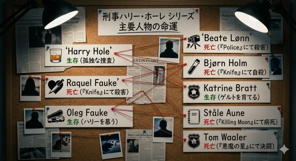 シリーズ全13作を終えた時点で、ハリーを取り巻く人々はどのように変化したのでしょうか。ファンとしては誰が生き残っているのか、非常に気になるところですよね。特に警察官の連続殺人が起きた「ポリス」以降、登場人物の退場が加速しています。ここでは最新のステータスを一覧表にまとめました。