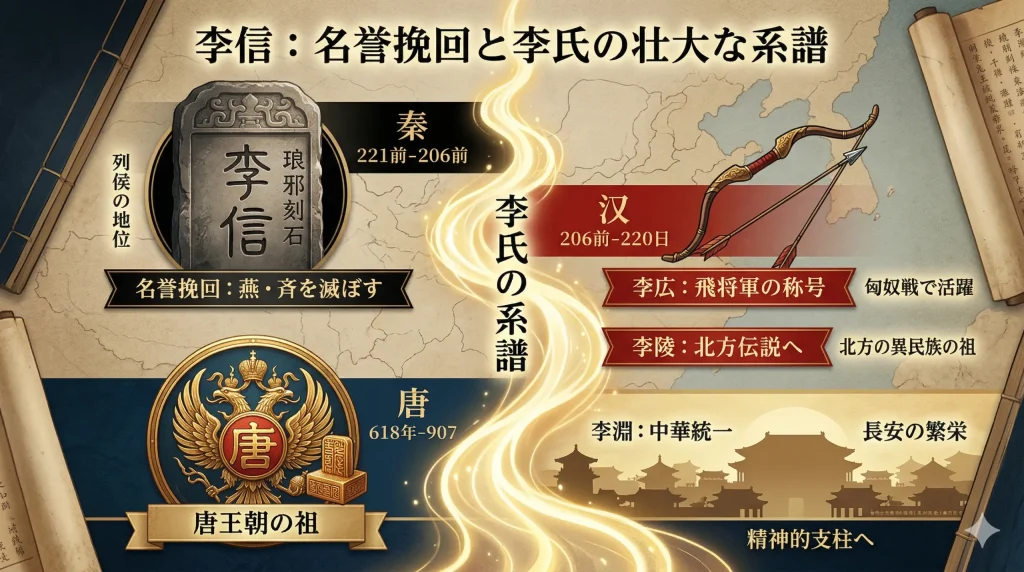 もしこの系譜が事実であれば(後世の仮託説もありますが)、信が目指した「戦のない世界」という理想は、数百年後の唐王朝という空前の平和な時代になってようやく、彼の子孫の手で実現されたことになります。信が秦という時代で戦い抜いた最後は、こうした歴史の巨大なうねりの源流となったのです。一人の「下僕」が抱いた夢が、やがて皇帝の座にまで至るというスケールの大きさこそ、李信という人物が歴史に選ばれた理由なのかもしれません。