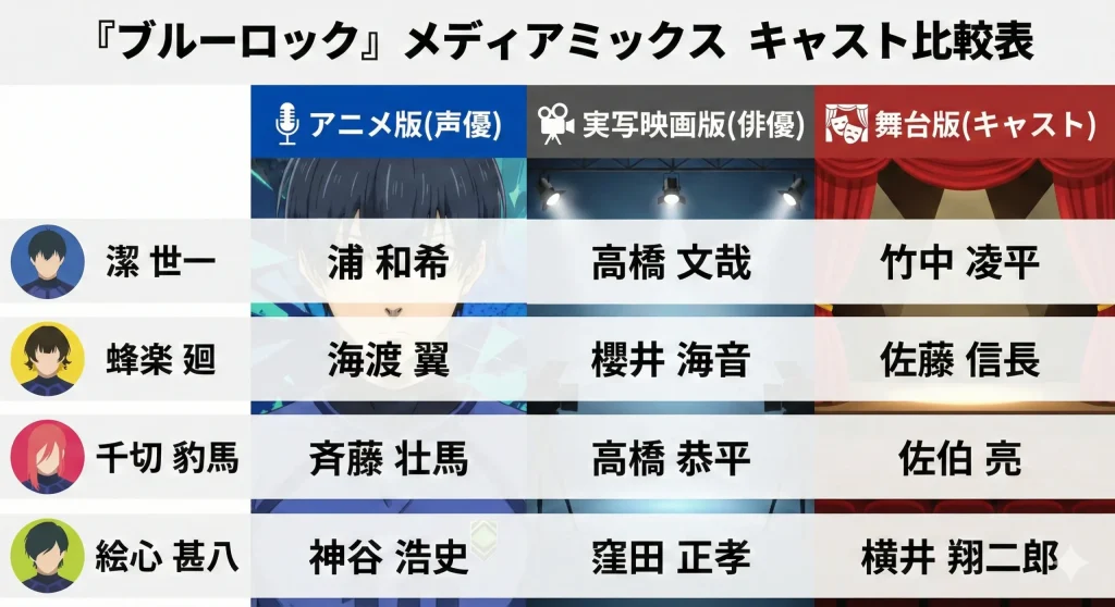 実写映画を120%楽しむために、すでに展開されているアニメ版や舞台版(ステブル)のキャストと比較してみるのも面白いですよ。アニメ版では、浦和希さんや海渡翼さんといった声優陣が、キャラクターに強烈な個性を吹き込みました。一方の舞台版では、竹中凌平さんが演じる潔世一が、2.5次元界隈で絶大な支持を得ています。実写映画版のキャストたちが、これらの先人たちが作り上げたイメージをどう受け継ぎ、あるいはどう塗り替えていくのかが見どころです。