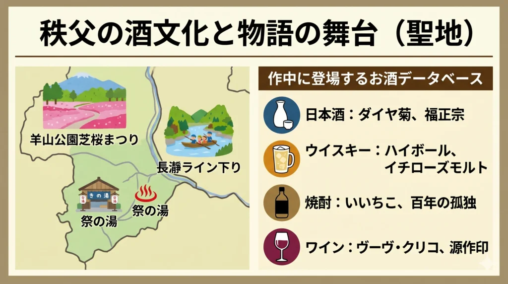 物語の象徴的なプロローグとして描かれるのが、埼玉県秩父市にある羊山公園の「芝桜まつり」です。一面に広がるピンクの絨毯のような芝桜を背景に、一人静かに、しかし心底幸せそうにウイスキーのハイボールを嗜む砺波いぶきの姿。それを見た上伊那ぼたんが「なんて美味しそうに飲むんだろう」と心を奪われるシーンから、すべては動き出しました。秩父という土地は、実は非常に豊かな醸造文化を持っていて、日本酒、ワイン、ビール、そして世界的に有名なウイスキーの蒸溜所まで揃っている「お酒の聖地」なんです。