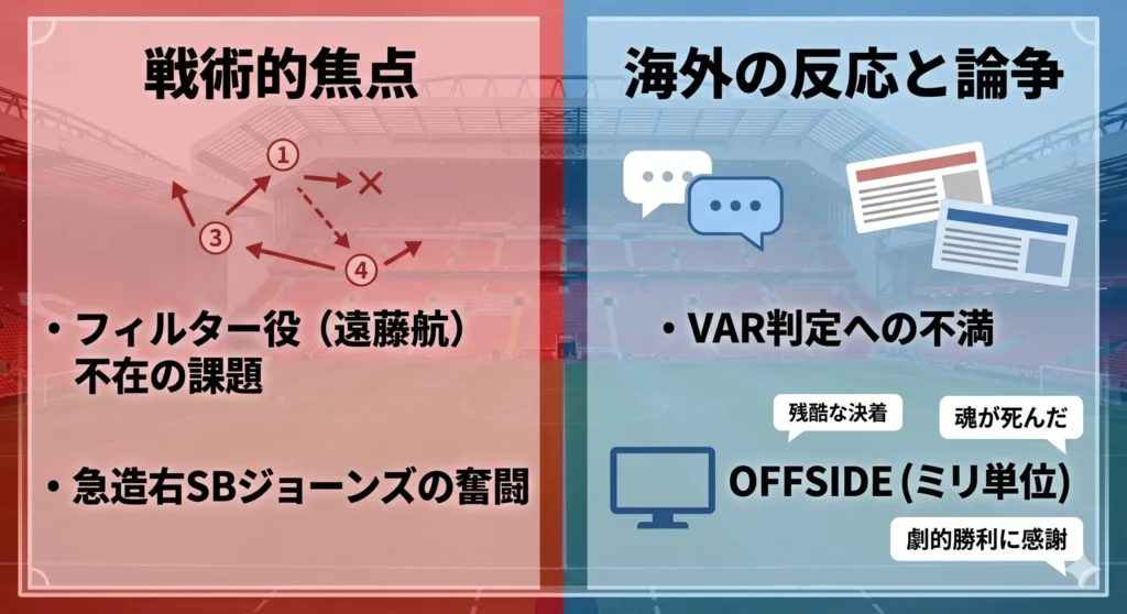 さて、ここからはさらに踏み込んで、現地のファンがSNSや掲示板でどのようなやり取りをしていたのか、そして戦術的な細かい変化について見ていきましょう。特に日本代表の遠藤航選手の不在が、リヴァプールの守備にどのような影響を与えていたのかは、日本のファンにとって見逃せないポイントです。