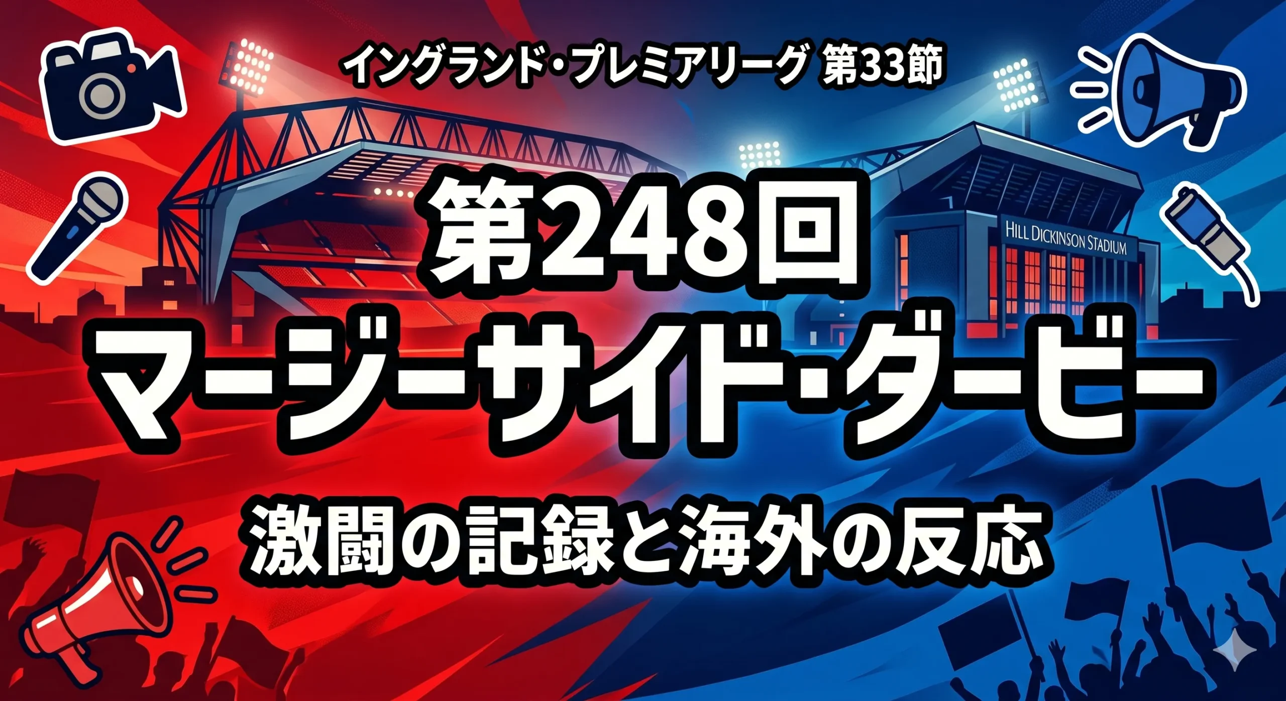 2026年4月19日、イングランド・プレミアリーグ第33節において、世界中が注目するマージーサイド・ダービーが開催されました。新スタジアムでの初開催という歴史的な一戦となった、リヴァプールとエヴァートンの試合結果や海外の反応が気になっている方も多いのではないでしょうか。今回のダービーは、試合終了間際の劇的なゴールによる決着だけでなく、VAR判定を巡る論争や深刻な負傷者リストなど、非常に見どころの多い内容となりました。日本代表の遠藤航選手の状況や、現地の熱狂的なファンの声、さらには今後の順位表への影響まで、私が調べた情報を網羅的に詳しくお伝えします。この記事を読めば、現地のメディアがどのように報じ、ファンが何に熱狂したのか、その全貌を深く理解できるはずです。