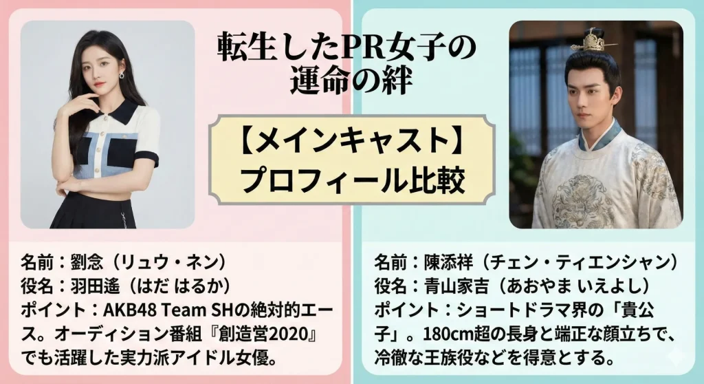 ドラマ「転生したpr女子の運命の絆」のヒロイン、羽田遙(はだ はるか)を演じているのは、中国で非常に高い知名度を誇る劉念(リュウ・ネン)さんです。彼女の演技を見て「アイドルみたいな華があるな」と感じた方は、まさに正解!彼女は、日本の国民的アイドルグループAKB48の海外姉妹グループである「AKB48 Team SH」の1期生として、現在も現役で活動しているアイドルなんです。
