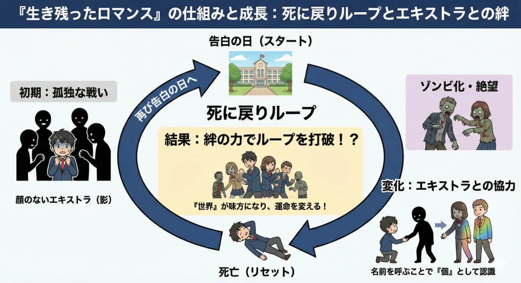 - 物語の鍵を握る死に戻りループの仕組みとエキストラたちの役割