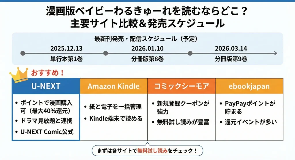 やはり一番のおすすめは、発行元であるU-NEXT Publishingと連携しているU-NEXTです。ドラマ版の見放題配信を楽しみつつ、毎月付与されるポイントを使って漫画を購入できるという、まさに「ベビわるファン」に最適な環境が整っています。ポイント還元率も高いので、継続的にシリーズを追うならここが第一候補になるかなと思います。