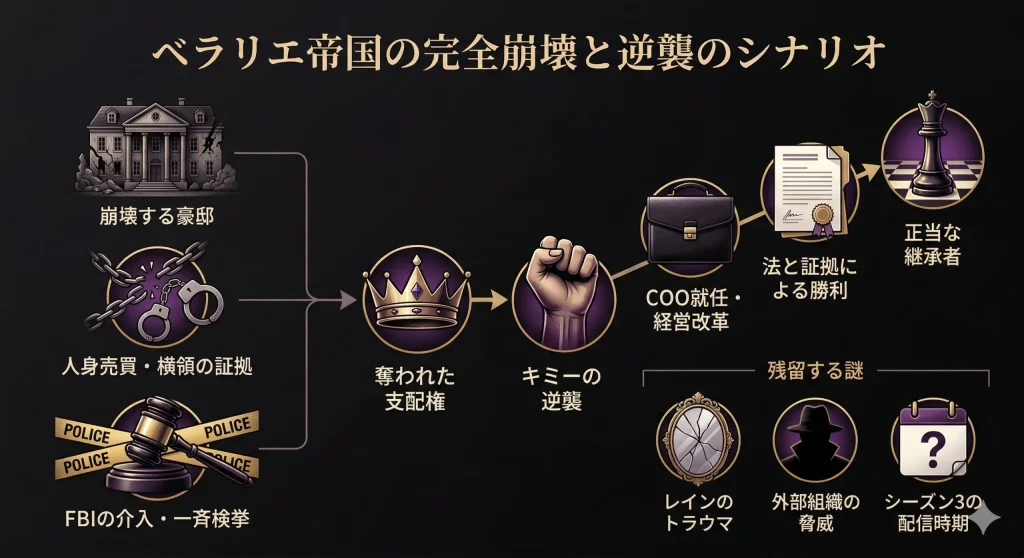シーズン2の終盤、ついに法の正義がベラリエ家に牙を剥きました。キミー、マロリー、そして家長ホレス本人までもが結託してFBIに提出した証拠は、あまりにも決定的で逃げ場のないものでした。これまで「金と権力」ですべてを揉み消してきた一族が、その同じ権力によって自滅していく様は、まさに自業自得という他ありません。主要メンバーたちの末路を改めて整理してみましょう。