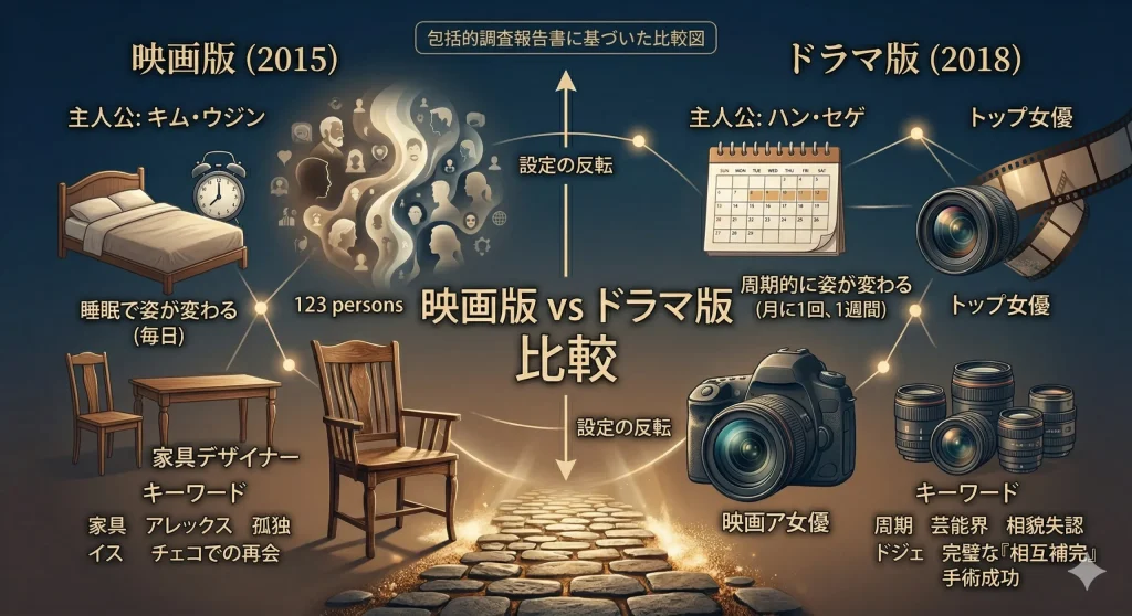 同じ原作アイデアを持ちながら、映画版とドラマ版ではその手触りが全く異なります。映画版は、どちらかというと「日常に潜む非日常」を淡々と描いており、ウジンの苦悩がより内省的に表現されています。一方でドラマ版は、芸能界や航空会社といった華やかな世界を舞台にしており、秘密を抱えるスリルや社会的な成功、挫折といったエンタメ要素が強めです。