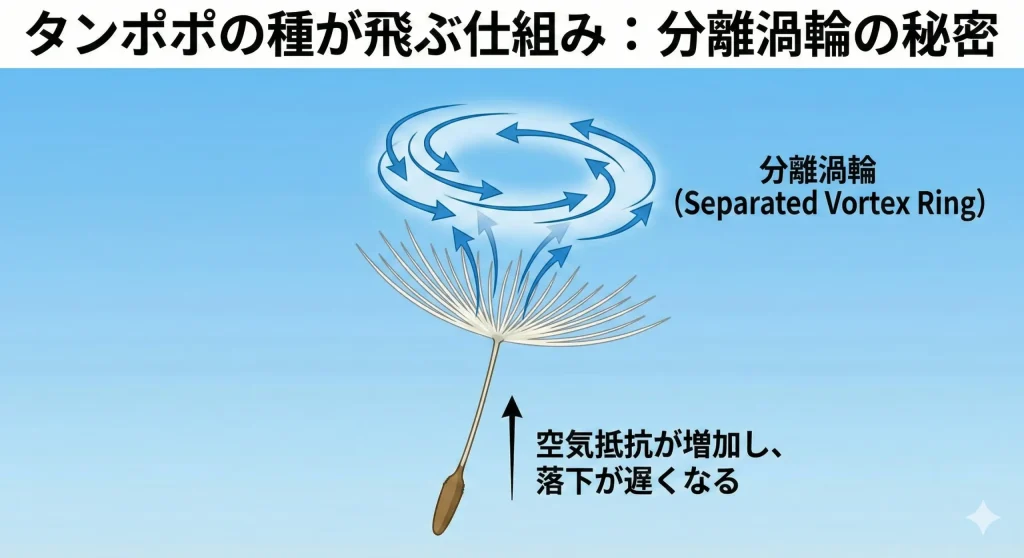ここで少し、知的な好奇心を満たすお話をしましょう。「ダンディーライオンドリフト」は、実は科学の世界でも非常にホットなキーワードなんです。タンポポの種がなぜあんなにも効率的に風に乗って遠くまで飛べるのか、その謎が2018年に発表されたある論文によって解明されました。その鍵となるのが、「分離渦輪(Separated Vortex Ring)」という特殊な物理現象です。