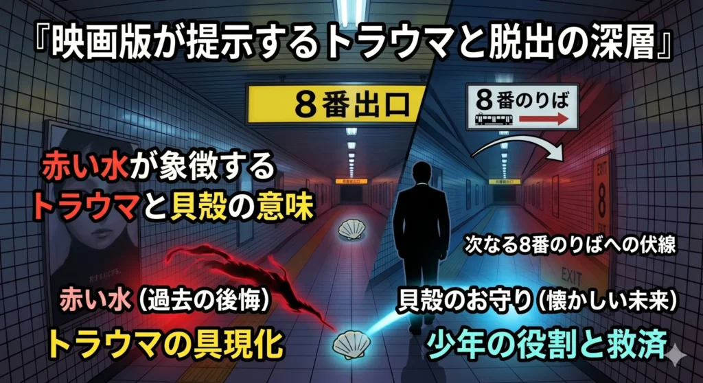 物語のクライマックスで重要な役割を果たすのが、通路を飲み込む「赤い水」と、途中で現れる「少年」です。赤い水は、単なるビジュアル的な恐怖演出ではなく、主人公が過去に経験した震災の記憶、特に「逃げ出した時の激流」の象徴です。彼にとって、この水から逃げることは、過去の自分を反復することであり、それでは決してループを抜けることはできません。一方で、この地獄のような通路で出会う少年は、異変の一種ではなく、主人公の失われかけた「良心」や「守るべきもの」の投影として描かれています。