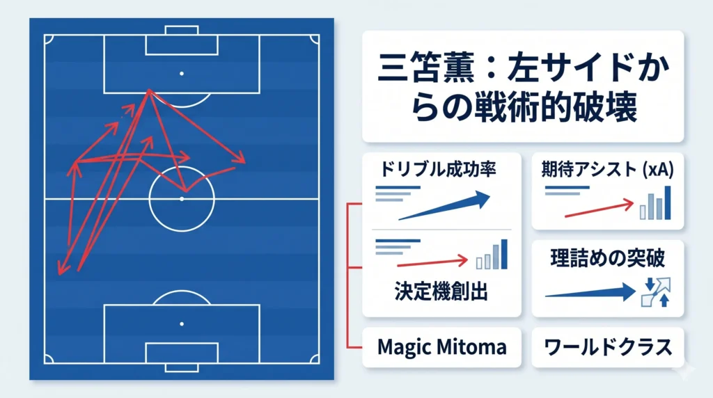 - 三笘は「マジック・ミトマ」として、戦術・技術の両面で海外から大絶賛されている