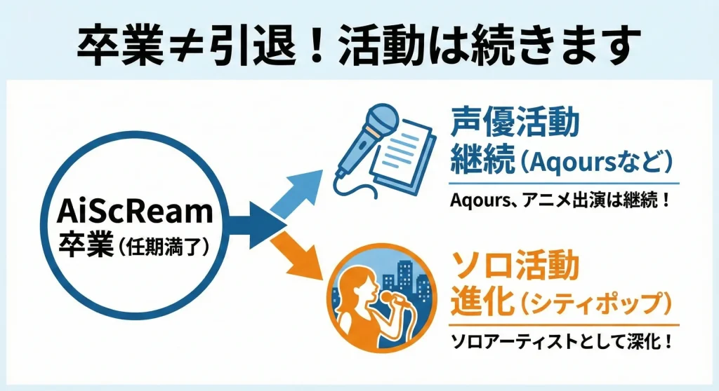 ここが最も心配な点ですよね。「ユニット卒業=Aqoursも卒業?」と考えてしまうのも無理はありません。しかし、繰り返しますが、降幡さんが黒澤ルビィ役を離れたり、Aqoursを卒業したりする予定は現時点ではありません。ラブライブ!サンシャイン!!という作品、そしてAqoursというグループは、彼女のキャリアの根幹であり、AiScReamとは全く別のプロジェクトとして運営されています。