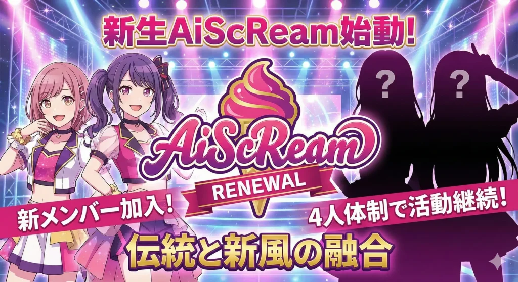降幡さんの卒業に伴い、ユニットは解散ではなく、2人の新メンバーを迎え入れる「リニューアル」の道を選びました。これは、運営側がAiScReamを一つの「恒久的なブランド」として確立させようとしている現れでしょう。2026年4月10日からは、新しい4人体制(大西亜玖璃さん、大熊和奏さん、そして新メンバー2名)での活動がスタートします。