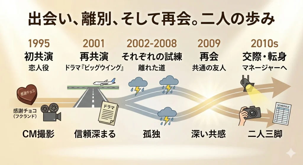 1990年代の芸能界は今よりもずっと制約が多く、多忙を極めるお二人がプライベートな時間を持つこと自体が困難だったという背景もあります。この初共演は、あくまで「素敵な仕事仲間」としての印象を互いに残すに留まりましたが、この時に感じた「直感的な好意」が、10数年後の再会において重要な鍵となるのです。当時のファンからすれば、このCMの頃に付き合っていれば……と思うかもしれませんが、この「長い回り道」こそが、後の二人の絆をより強固なものにしたのだと、今の二人を見ていると感じてしまいますね。