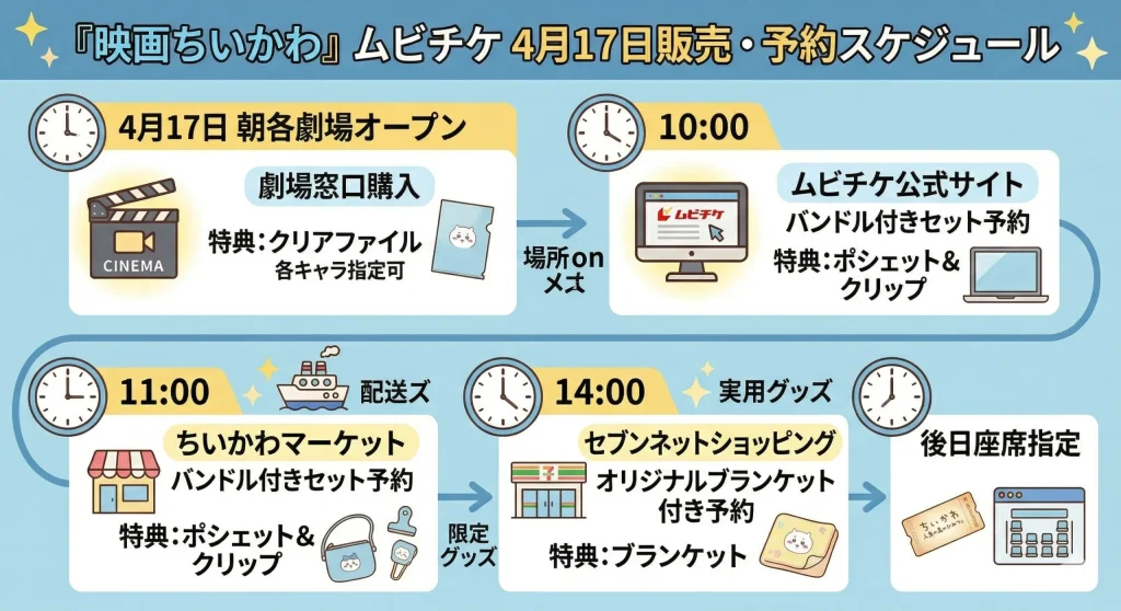 2026年4月17日の午前中は、まず最寄りの劇場のオープン時間に合わせて現地へ向かいましょう。早ければ8時や9時といった時間帯です。ここで第一希望のクリアファイルを確保します。無事に買えたら、次は11:00のちいかわマーケット。スマホの電波が良い場所を確保してポシェットセットを狙います。そして午後の14:00にはセブンネット。ここまで完遂できれば、まさに「ちいかわフルコンプ」の達成です。もし平日の仕事で動けないという場合は、無理をせず4月27日からのムビチェキ受注を狙うのが、精神衛生上も最も良い選択だと思います。