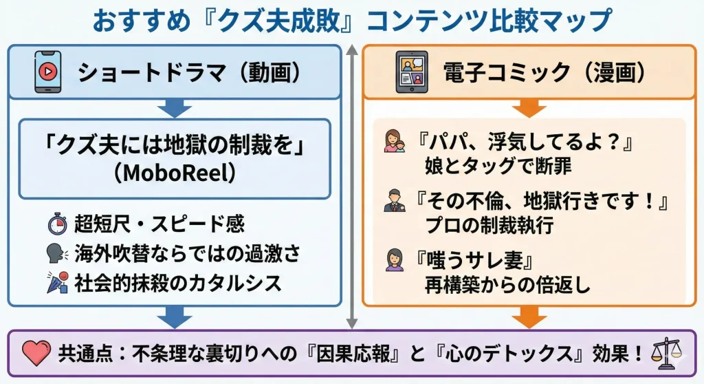 ここからは、ドラマ版を愛する皆さんにこそ読んでほしい、厳選された「クズ夫成敗系」の漫画たちをご紹介します。どの作品も、タイトルだけで内容が伝わってくるようなインパクトのあるものばかり。あなたの心の中にある「モヤモヤ」を、漫画のキャラクターたちが一気に吹き飛ばしてくれること間違いなしですよ。それでは、めくるめく復讐漫画の世界を覗いてみましょう。