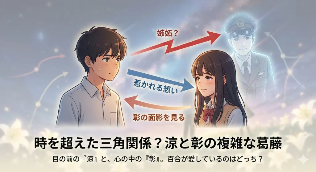 涼は時折、自分ではない誰かの感情が流れ込んでくるような感覚に襲われます。それは、かつて彰が抱いた「百合を守りたい」「生きていてほしい」という強い願いでした。この想いが涼を動かしている一方で、彼は「自分は彰の身代わりなのか?」という問いに苦しみ続けます。この自己同一性を巡る葛藤こそが、本作に深いドラマ性を与えているポイントですね。単に「前世の恋人と再会してハッピーエンド」という安易な展開に逃げないところが、この作品が多くの若者に支持される理由なんじゃないかなと思います。