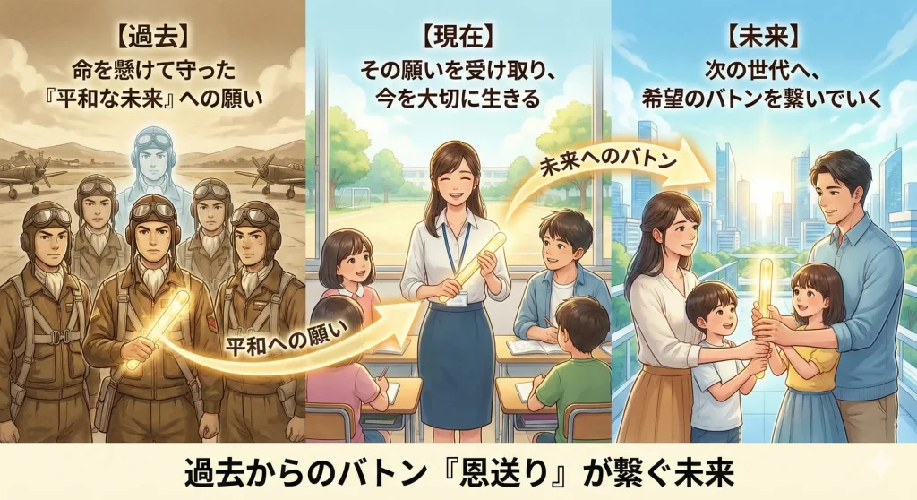 本作を語る上で絶対に外せないキーワードが「恩送り(おんおくり)」です。皆さんはこの言葉の意味をご存知でしょうか。受けた恩を直接その人に返すのではなく、別の人へ、そして次の世代へと繋いでいくことを指します。彰をはじめとする特攻隊員たちが、命を懸けて守りたかったのは、単なる土地としての日本ではなく、そこに住む大切な人たちの「笑い声」や「自由」でした。