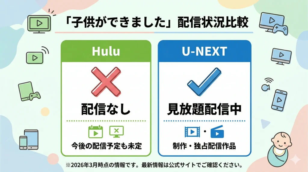 最後までお読みいただき、ありがとうございます!ここまで詳しく調査してきた結果、「子供ができました」の配信はU-NEXTの独占であり、残念ながらHuluでの視聴は現時点では叶わないことが分かりました。Huluユーザーの方にとっては少し残念なニュースかもしれませんが、U-NEXTの初回特典などを上手に使えば、実質的に負担なく楽しむことも可能です。