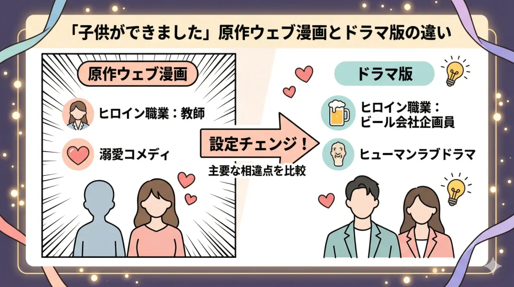 ドラマ「子供ができました」をより深く楽しむためには、原作ウェブトゥーンとの設定の違いを知っておくのがおすすめです。原作はLINEマンガなどで「子供ができました」として配信されており、多くの読者に愛されている人気作ですが、ドラマ化にあたっていくつかの大胆なローカライズと設定変更が行われています。