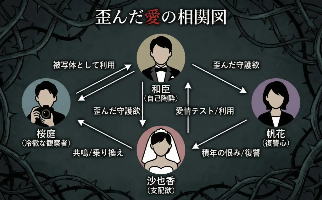 和臣と沙也香の関係性は、ミステリーの枠を超えた「共依存の解剖」そのものでした。和臣は、自分が介在しなければ生きていけないような、脆くて壊れそうな存在を常に求めていました。それは、相手を助けることで「自分には価値がある」と思い込みたかったからです。一方の沙也香は、その和臣の欲求を瞬時に察知し、完璧な「守られるべき弱者」を演じ続けました。お互いのパズルのピースが、歪んだ形で噛み合ってしまったのがこの夫婦の悲劇です。