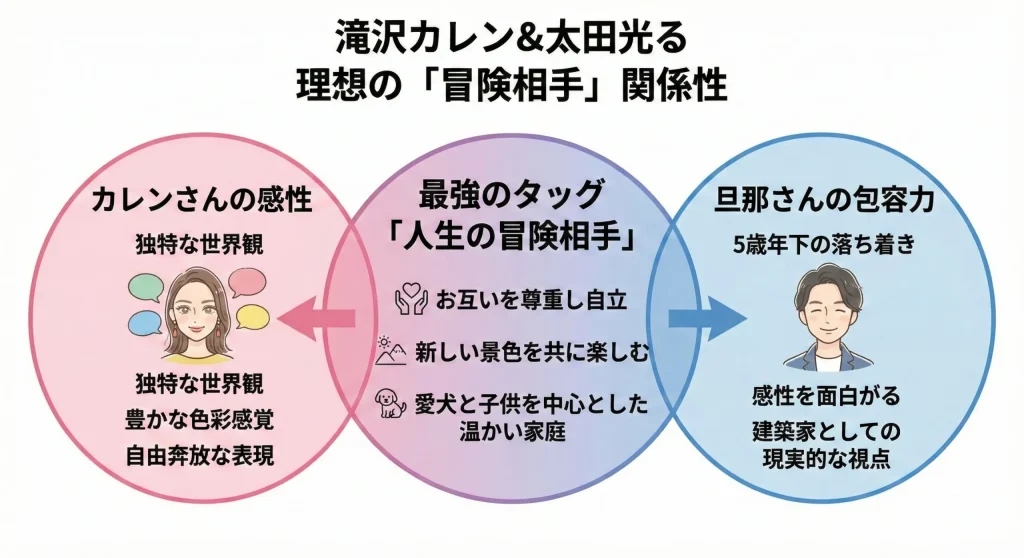 滝沢カレンさんが自身の結婚を報告した際、旦那さんのことを「人生の冒険相手」と定義したことは、日本の結婚観に新しい風を吹き込みました。単に「夫」や「パートナー」という言葉で片付けるのではなく、これから先の長い人生という旅路において、共に驚き、共に困難を乗り越え、新しい景色を楽しみに行く「仲間」であるという決意表明でした。カレンさんのこの言葉選びには、旦那さんである太田光るさんへの、これ以上ないほどの最大級の信頼と愛情が込められています。