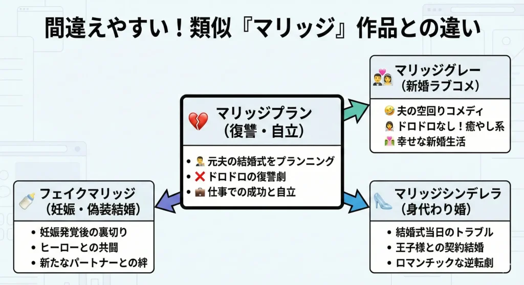 では、なぜ間違えられるのか。それは「マリッジ」という言葉を含む恋愛漫画が非常に多いため、電子書籍サイトのレコメンド機能や、不正確なまとめサイトが誤って紐付けてしまった可能性が高いです。マリッジプランは「復讐・自立」という大人向けのビターなテーマ。対して綾瀬先生の作品は「王道のキュンとする少女漫画」。ターゲット層も雰囲気も全く異なるので、先生のファンの方は「新作かな?」と勘違いされないように注意が必要です。正確な情報は常に公式サイトで確認することが大切ですね。