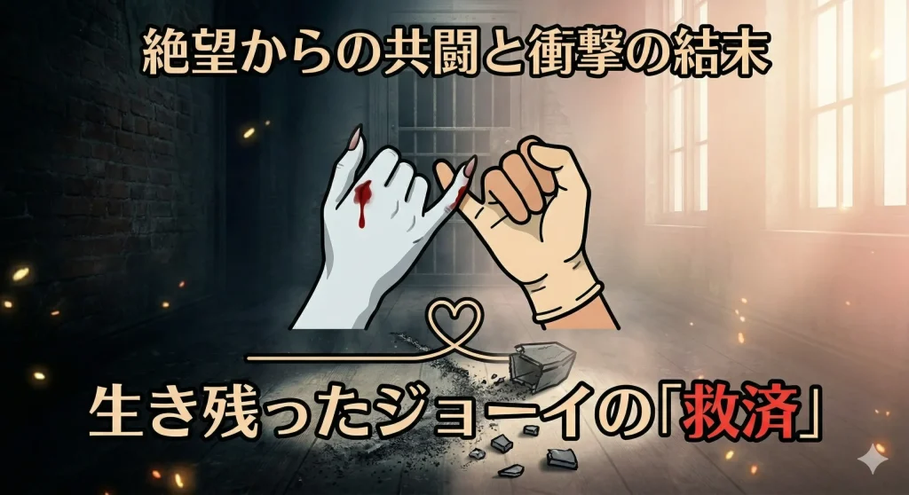 ラザールは娘の願いを聞き入れ、ジョーイの生存を許します。ジョーイは血塗られた邸宅から脱出し、夜明けの空の下へと踏み出します。彼女には、薬物依存という過去や、手放してしまった息子との関係という、向き合わなければならない現実が待っていました。しかし、この地獄を生き延びた彼女の表情には、以前にはなかった強い決意が宿っています。アビゲイルが最後に交わした「指切り」の仕草は、孤独な怪物と疎外された人間が心を通わせた唯一の証として、観客の心に深い余韻を残します。