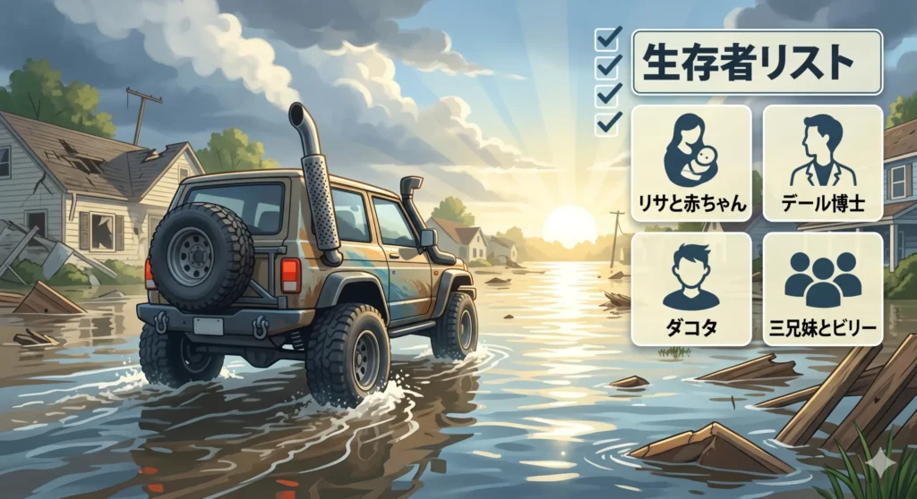 最終的にリサは、生まれたばかりの赤ん坊を抱え、水面上にある棚に身を寄せて救助を待ちます。デールや三兄妹たちが彼女の元へ辿り着いた時、彼女が赤ん坊をぎゅっと抱きしめて泣き崩れる姿には、視聴者の誰もが胸を熱くしたはずです。結果として、リサと赤ちゃんは無事に生存。彼女は、危機管理が甘いと一部で批判されがちな行動もありましたが、最終的に「二つの命」を守り抜いた最強の母親として物語を終えました。生存者リストの筆頭にリサと赤ちゃんの名が刻まれたことは、ファンにとって最大の救いとなったに違いありません。