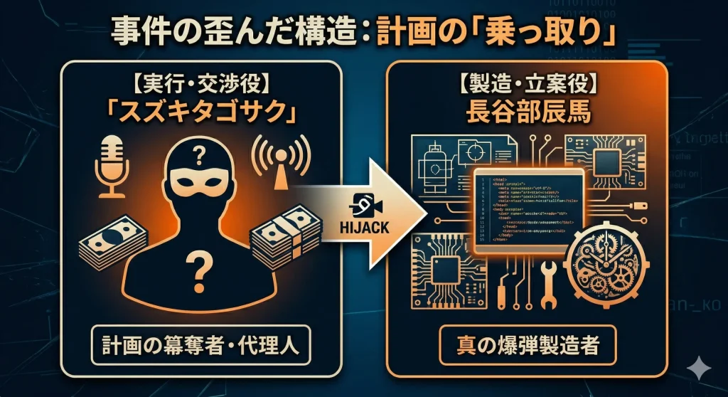 スズキは辰馬の遺体と、遺された膨大な爆弾、そしてテロ計画の全貌を知ると、それを自らのものとして「乗っ取る」ことを決意します。彼は明日香に「死体を隠す代わりに、俺が犯人になってやる」と持ちかけました。スズキの目的は、明日香への恩返しなどといった美しいものではありません。彼は、自分が「巨悪の首謀者」として警察を翻弄する舞台を手に入れることに、至上の喜びを感じていたのです。
