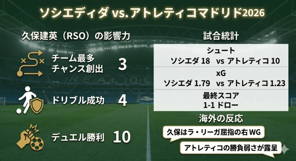 また、後半55分に生まれたゴンサロ・グエデス選手の同点ゴールも、久保選手がプレスを引き付けてから放った絶妙なパスが起点となっていました。派手なアシストという数字には表れにくい部分ですが、現地のスカウティング専門家は「あのパス一本でアトレティコの守備陣のズレを生じさせた」と分析。まさに数値化できない部分での貢献度も、世界レベルで高く評価されている理由なのかなと感じましたね。