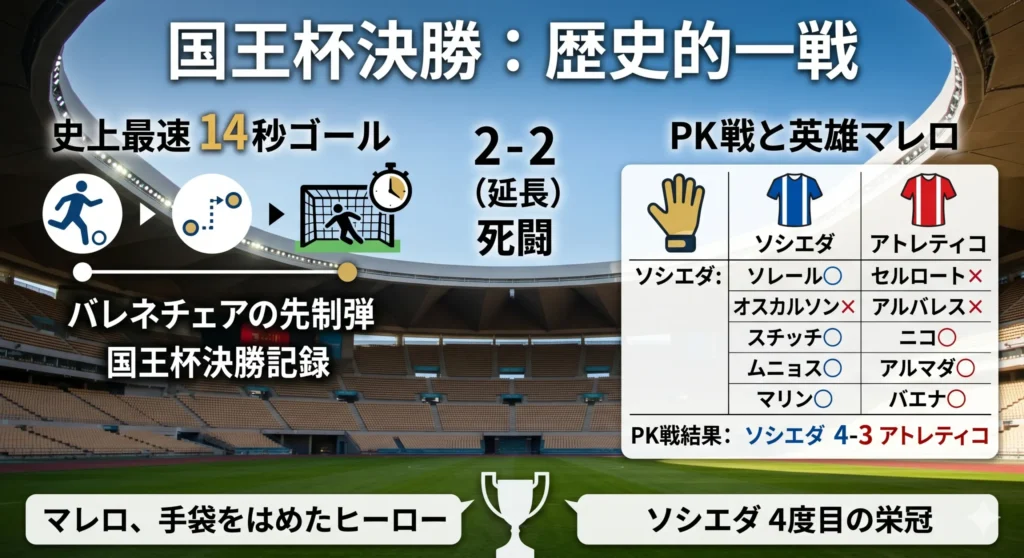 ホイッスルが鳴った直後、スタジアム中の人々が度肝を抜かれました。レアルソシエダがキックオフの流れからそのまま左サイドを突破し、アンデル・バレネチェア選手が頭でネットを揺らしたのです。その時、電光掲示板の時計はわずか「14秒」を指していました。これは国王杯の長い歴史、特に対象を「決勝戦」に限定した場合には不滅とも言える史上最速ゴール記録となりました。