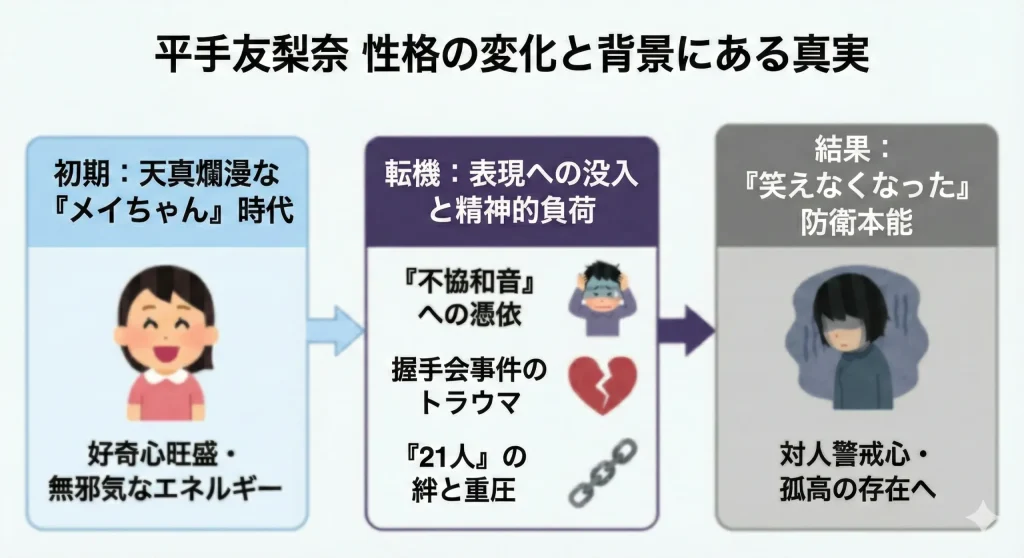 アイドルを観ているにもかかわらず、観客が「元気をもらう」どころか「ただただ心配になる」という異様な空気感は、当時の彼女が背負っていた負担がいかに過酷だったかを物語っています。この時期の強烈なインパクトが、現在の彼女に対しても「冷たい」「気難しい」といったパブリックイメージとして、根強く尾を引いている面は否定できません。
