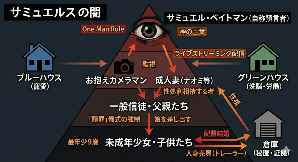 - 教団内では「贖罪」という名の性的儀式や、10名もの未成年者を含む強制結婚・人身売買が常態化していた。