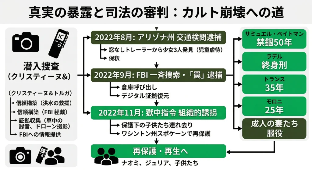 2022年、ついに捜査当局による「サミュエル派」解体作戦が実行に移されました。そのきっかけは、皮肉にも偶然の出来事でした。2022年8月28日、アリゾナ州フラッグスタッフ近郊で警察が行った交通検問において、ベイトマンが運転する不審なトラックが停止させられました。警官が彼が牽引していた窓のないトレーラーの中を覗き込むと、そこには小さな指が隙間から見えたと言います。中を確認したところ、11歳から14歳の少女3人が、換気も不十分で、バケツをトイレ代わりにするという劣悪な環境で監禁されていたのです。