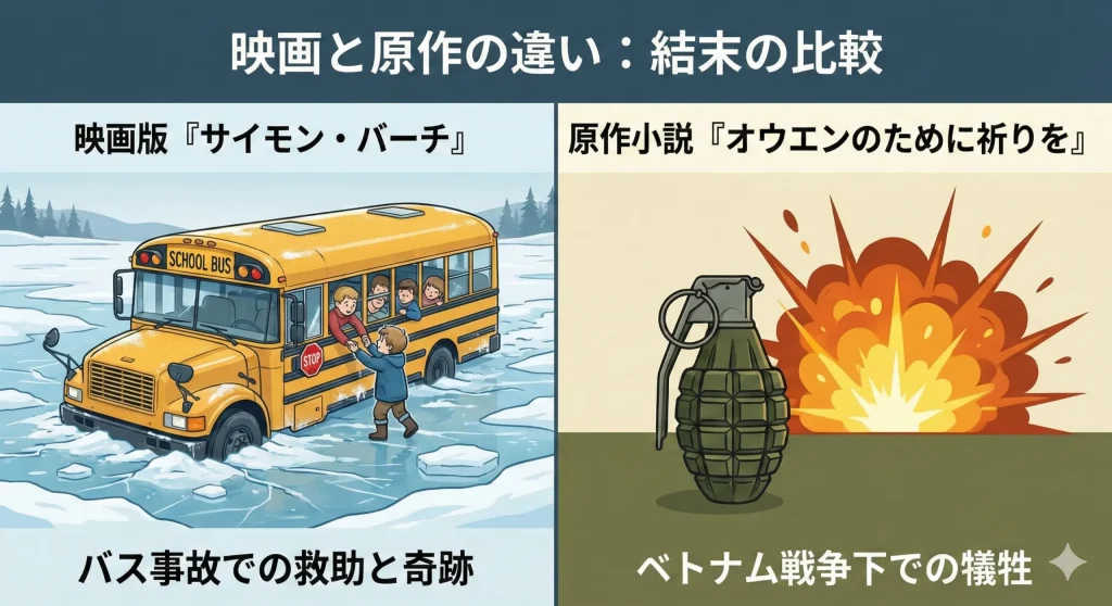 映画版『サイモン・バーチ』と、その着想源となったジョン・アーヴィングの原作『オウエンのために祈りを』には、いくつかの決定的な違いが存在します。まず、物語のスケールです。原作は上下巻にわたる大作で、物語の後半はベトナム戦争という非常に重い政治的・歴史的背景が絡んできます。主人公オウエン(サイモンのモデル)の死も、映画のようなバス事故ではなく、ベトナム戦争に関連するテロの現場で、子供たちを助けるために手榴弾で自爆するという、より壮絶で凄惨な描写になっています。映画版が「家族で見られる感動ドラマ」を目指したのに対し、原作は国家や宗教、運盟の不条理性に対する痛烈な批判を含んだ「社会派文学」の側面が強いのです。