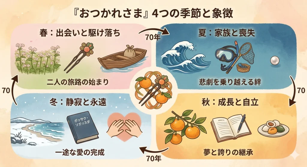 見どころは何といっても、全16話が「春・夏・秋・冬」の4つの季節に分割されているという特異な構成です。人生の移ろいを季節の美しさと重ね合わせることで、視聴者は時間の重みをより深く感じることができます。単なるロマンスに留まらず、済州島特有の海女文化や厳しい家父長制、さらにはIMF通貨危機といった韓国の近現代史を背景に、個人の感情の機微を逃さない叙情的なヒューマンドラマへと昇華されています。特に済州島の方言が持つ温かみと力強さが、過酷な時代を生き抜く主人公たちの生命力を際立たせており、これこそがおつかれさまのネタバレをネトフリで探す読者が最も心打たれるポイントかなと思います。
