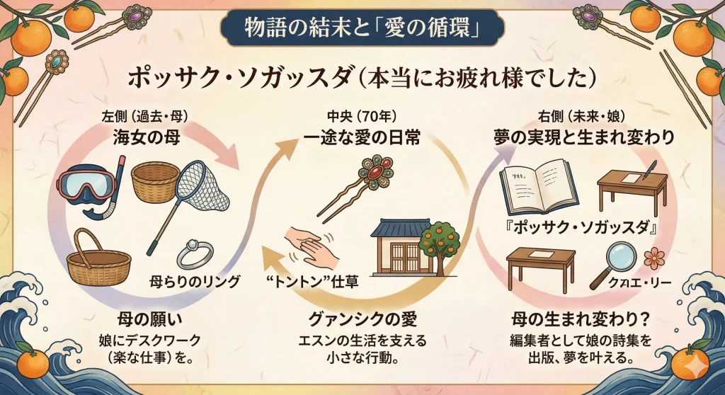 さらに驚くべき伏線が、編集者のクロエ・リーという人物です。彼女は、若き日のエスンが怒りに任せて捨てた指輪を畑で見つけた少女であり、その容姿は亡き母グァンレと瓜二つでした。視聴者の間で有力なのが、彼女が「母グァンレの生まれ変わり」であるという説です。かつて「娘に自分のような苦労をさせたくない、デスクワークのような楽な仕事をさせてあげたい」と願いながら亡くなった海女の母が、時を超えて編集者(デスクワーク)として生まれ変わり、娘の長年の夢を叶える手助けをしたという解釈です。この「愛の循環」を完成させる演出により、物語は悲しみを乗り越えた先にある、永遠の命の繋がりを描き切ることに成功しました。