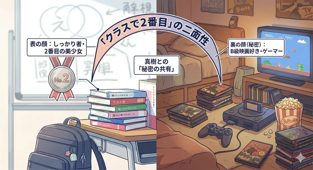 しかし、この「2番目」というレッテルは、海にとって自分の本当の姿を隠すための仮面でもあったんです。彼女は周囲の期待に応えるために「完璧な2番目」を演じてきましたが、その裏ではB級映画やマイナーなゲームを愛するマニアックな一面を持っていました。主人公の前原真樹は、誰もが見ている「2番目の海」ではなく、誰も知らない「等身大の海」に惹かれたわけです。
