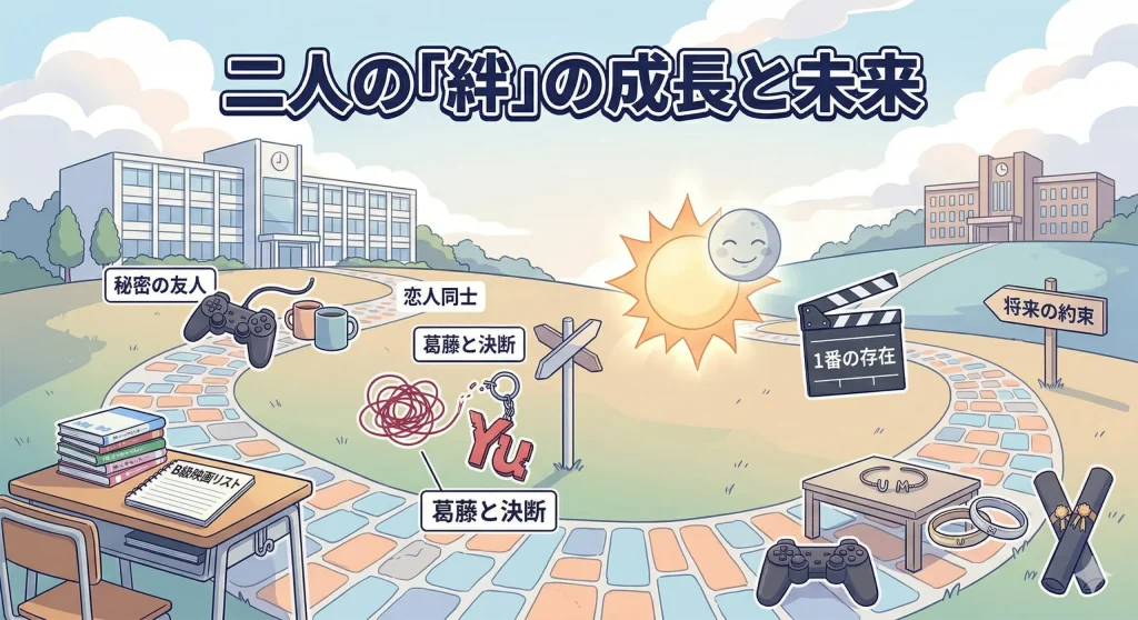 後半戦では、物語がより深い次元へと進んでいく様子をお伝えします。高校生活という青春の終わり、そして大人への第一歩を踏み出す二人の姿。家族や友人たちとの関係修復も含め、この物語がいかに「救い」に満ちたものであるかをご紹介しましょう。