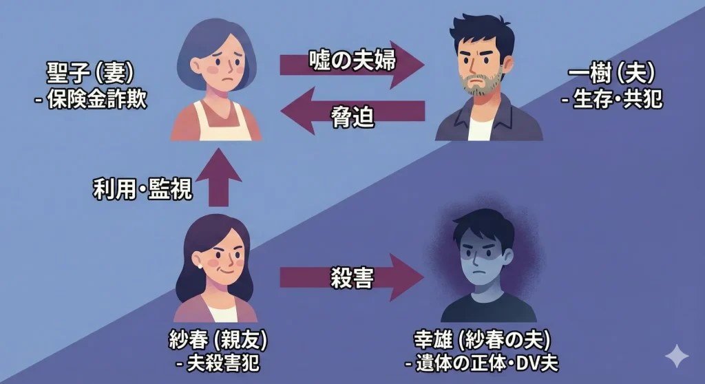 第7話で明かされた真実は、本作最大の転換点となりました。聖子が夫の一樹だと信じて引き取った遺体の本当の持ち主は、聖子の親友・紗春の夫である葛原幸雄だったのです。さらに衝撃的なことに、幸雄を殺害したのは他ならぬ妻の紗春でした。紗春は聖子と知り合う前から、夫を殺害し、その遺体が行方不明の一樹として処理されるように工作、あるいはその状況を確信して聖子に接近していたのです。聖子が抱えていた「夫が生きていた」という秘密に対し、紗春は「夫を殺した」というさらに重い罪を抱えていました。これによって、物語の構図は「被害者の妻」と「加害者の妻」が入れ替わり、二人は互いの秘密を握り合う運命共同体となりました。「親友だと思っていた人は、自分の罪を隠すために自分を利用していた」という事実は、聖子の精神を激しく揺さぶります。しかし、皮肉なことに、聖子もまた一樹を隠し、保険金を守るために紗春の罪を利用せざるを得なくなります。この第7話のネタバレを知った上で最初から見返すと、紗春の何気ない言葉の一つ一つが、聖子を監視し、誘導するための罠だったことが分かり、ゾッとするような恐怖を感じますね。二人の女性が、それぞれの「家族の平穏」というエゴのために手を組む姿は、人間の業をこれでもかと見せつけてくれます。