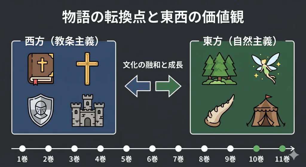 東方の蛮族たちは、厳しい自然環境の中で生き抜くために、非常に合理的かつ開放的な価値観を持っています。第4巻の温泉回や日常の描写で描かれるように、彼らにとって肉体は隠すべき卑猥なものではなく、生命の躍動そのもの。この価値観の違いが、初期のコミカルなすれ違いを生み、中盤以降の深い相互理解へと繋がっていく構成は見事としか言いようがありません。西方の「型」に嵌まった生き方と、東方の「生」を謳歌する生き方。その中間点に立つセラが、どちらの良さも認めながら新しい自分の居場所を作っていく姿には、現代を生きる私たちも共感できる部分が多いかなと思います。