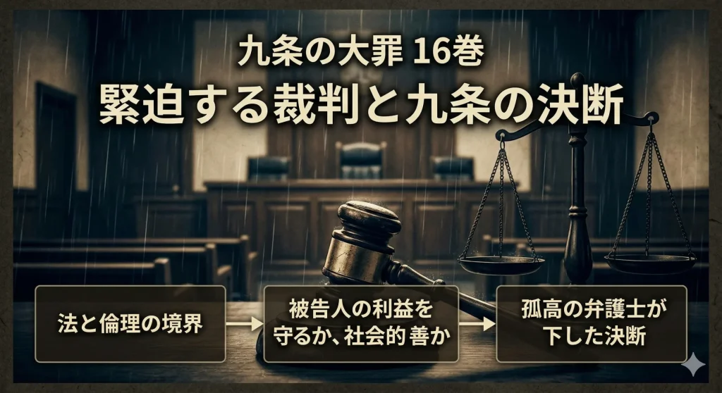 九条の大罪 16巻 ネタバレ 感想について、発売前から心待ちにしていたファンも多いのではないでしょうか。私もその一人で、最新刊が出るたびに「今回はどんな倫理の境界線を見せつけられるのか」と少しの恐怖と大きな期待を持ってページをめくっています。物語が佳境に入るにつれ、九条弁護士の周囲ではあらすじの予想を超えるような激動の展開が続いていますよね。結末がどうなるのか、ネット上での考察や試し読みでの反応を追いかけている方もいるかもしれませんが、やはり一冊を通して読むことで得られる衝撃は格別です。無料で読める断片的な情報だけでは味わえない、真鍋昌平先生が描く人間の深淵と社会の歪みが、この16巻には凝縮されています。この記事を読むことで、16巻で起きた出来事の整理や、読後に抱くモヤモヤとした感情の正体を共有し、これからの物語がどこへ向かうのかを一緒に考えていければと思います。
