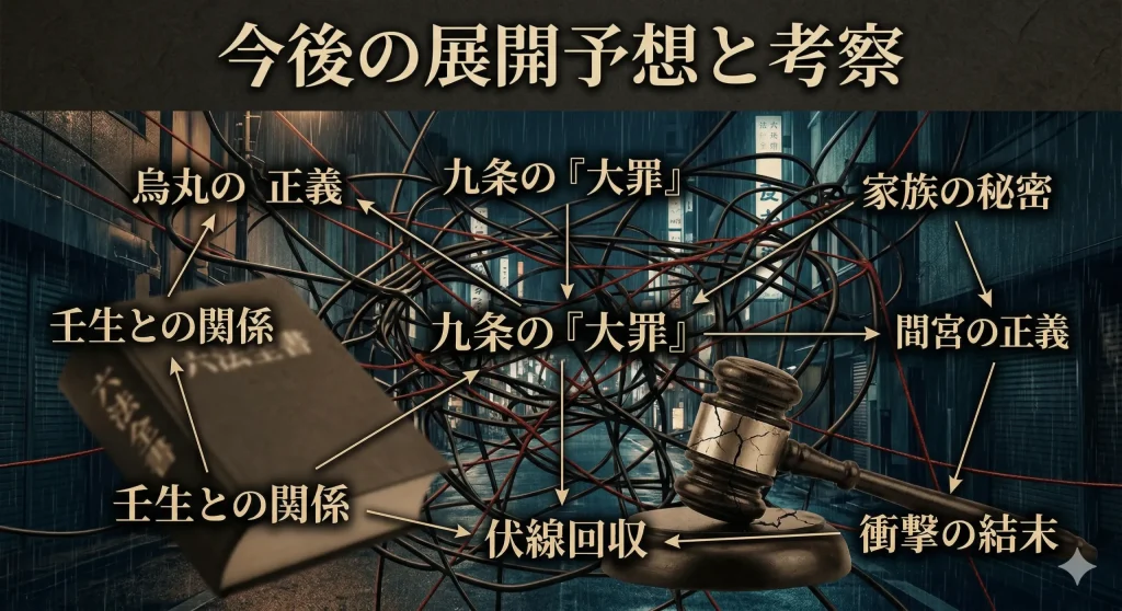 私の考察では、九条は最終的に間宮を利用して、自分自身を「裁かせる」のではないかと考えています。九条がこれまで積み上げてきた「大罪」は、彼自身の心をも蝕んでいます。彼が求めているのは勝利ではなく、自らの破滅を通じた一種の浄化なのではないか……。16巻での九条のどこか自暴自棄にも見える行動は、自分を追いつめるための布石のようにも映ります。二人の関係性は、単なる敵同士ではなく、同じコインの表と裏。最終的に彼らがどのような結末を迎えるのかが、物語全体のテーマである「罪と罰」の答えになるはずです。
