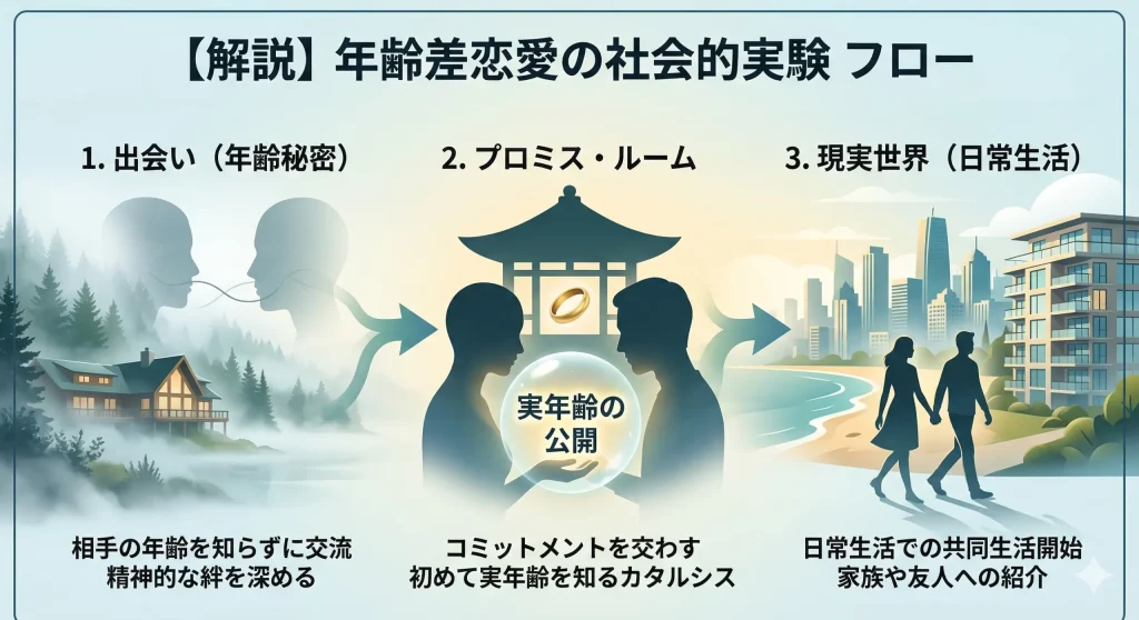 この番組の構成は、視聴者が飽きることなく、それでいてじっくりと考えさせられる絶妙なスケジュールで組まれています。全8エピソードは、物語の進展に合わせて3つのパートに分けられて配信されます。第1回から第5回までの「パート1」では、カナダの美しいリゾート地で、互いの年齢を知らないまま交流を深める日々が描かれます。ここで最も象徴的なのが、「プロミス・ルーム」と呼ばれる特別な部屋での年齢公開です。絆が深まったと感じた二人は、この部屋で指輪を交換し、お互いの実年齢を明かす儀式を行います。この瞬間の、驚き、戸惑い、そして時として訪れる安堵の表情は、まさにこの番組のハイライトと言えるでしょう。この一連の流れは、Netflixの公式サイトでも詳しく紹介されています。(出典:Netflix『Age of Attraction: Meet the Singles Proving Age Is Just a Number』)