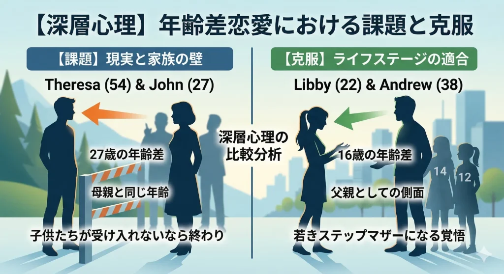 - 未来の展望:ジョンがこれから家庭を築きたい世代なのに対し、テレーザはすでに子育てを終えている。