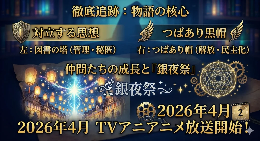 銀夜祭編が完結した後、物語はさらに大きな転換点を迎えています。祭りのフィナーレで起きた「帷蛭(とばりびる)」の暴走事件は、魔法の秘密を隠し通してきた図書の塔の体制に大きな亀裂を入れました。一般の人々の目の前で、魔法が「描くもの」であることが露呈しかけ、魔法に対する不信感と期待が街中に渦巻いています。これを受けて魔法界の上層部も動き出しており、これまでの「隠蔽」一辺倒だった方針を維持できるかどうかの瀬戸際に立たされています。