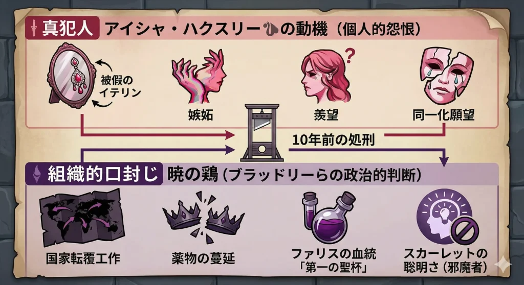 組織の幹部であるブラッドリーは、スカーレットがあまりにも聡明であり、国家の不正や「エリスの聖杯」に関わる重大な秘密に気づき始めていたことを危惧していました。彼女が生き長らえれば、自分たちの利権が脅かされる。そこで彼らは、アイシャが用意した稚拙な証拠を公権力を使って「本物」として確定させ、迅速に処刑を執行したんです。これが、スカーレットが公的な「悪女」として葬られた裏のメカニズムでした。